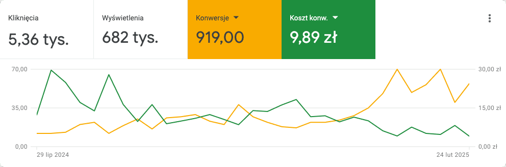 Wysoką skuteczność przy tak niskim budżecie osiągnąłem dzięki rezygnacji z kampanii inteligentnych na rzecz strategii opartej na precyzyjnym doborze słów kluczowych oraz ich stałej optymalizacji. Obniżyłem koszt konwersji także za pomocą optymalizacji stawek i wykluczaniu nieefektywnych fraz.